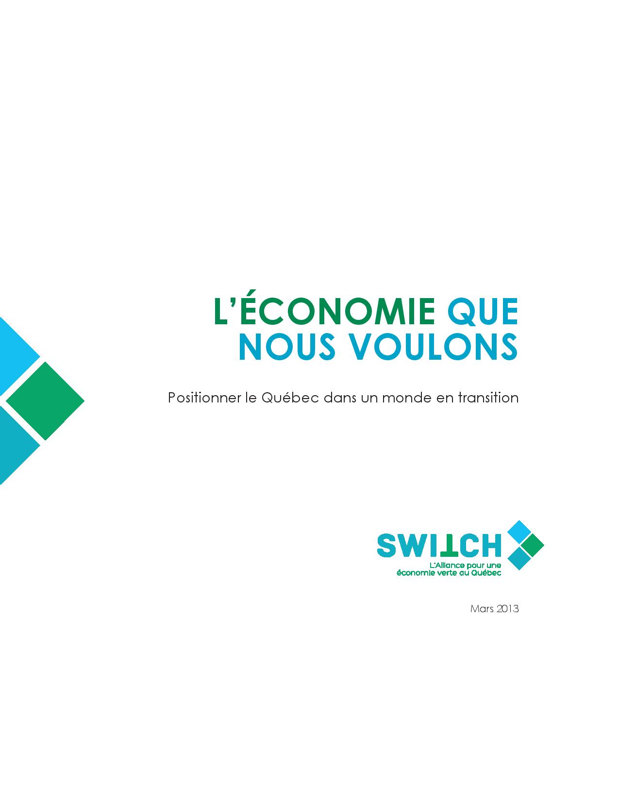 Séguin, Hugo and Gabriel Marquis. L’économie que nous voulons : le Québec au rendez-vous de l’économie verte (The Economy We Want: Québec’s Rendez-Vous With the Green Economy). SWITCH, the Alliance for a Green Economy in Québec, February 2013.